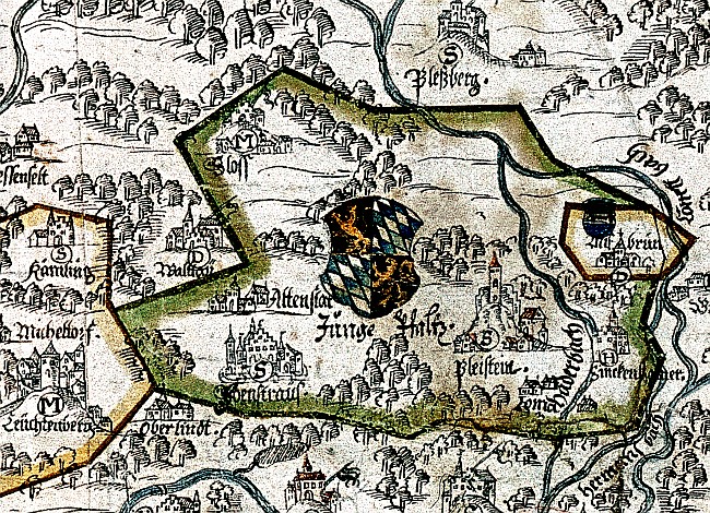 Gründliche Verzaichnuß deß löb. Chur.: und Fürstenthumbs der Obern Pfaltz, 1631, Hans Christoph Sachs, StA Amberg, Pl 1126, Ausschnitt "Junge Pfalz" mit Leuchtenberg und Miesbrunn (Edgar Krausen 582)