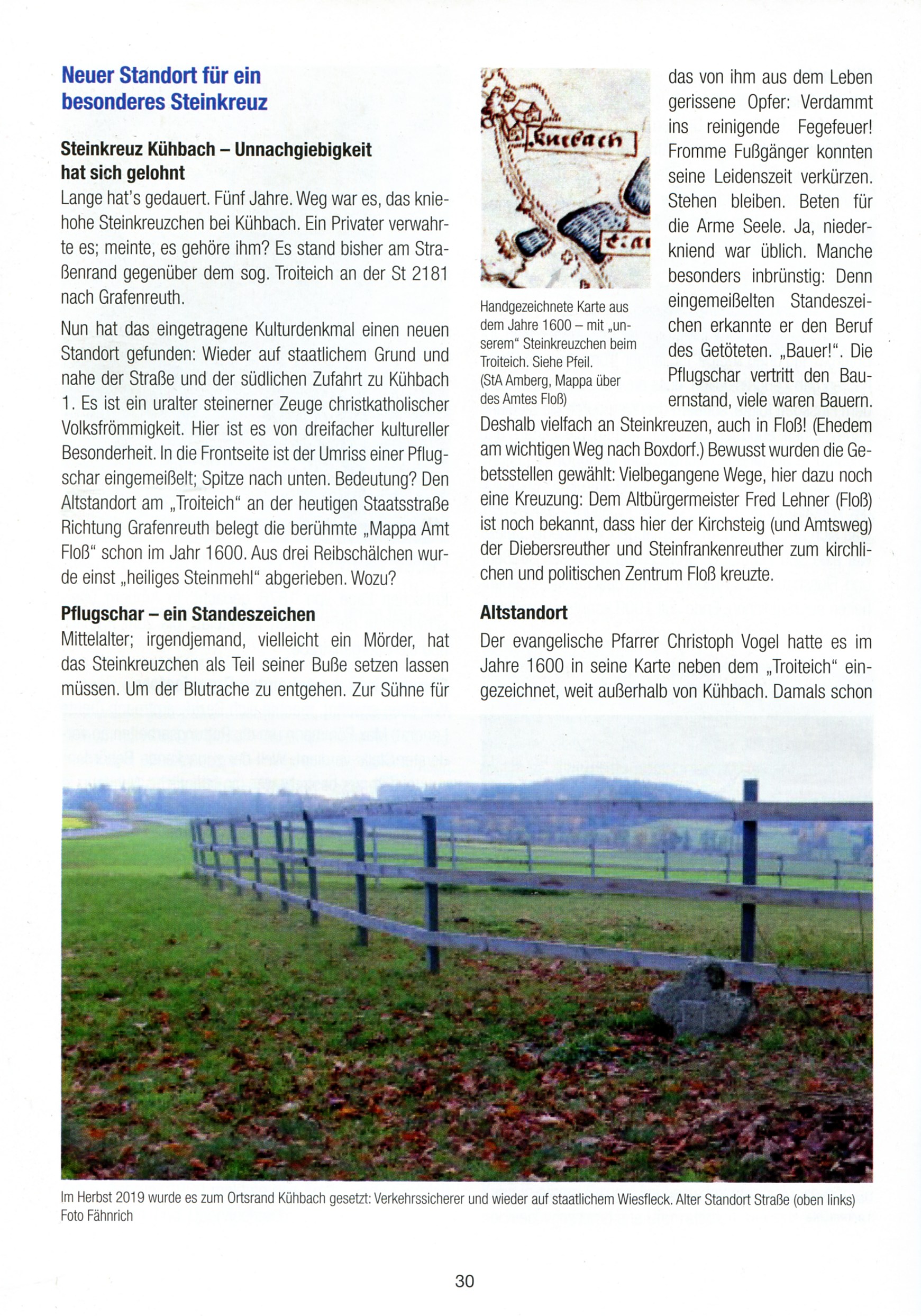 Das Steinkreuzchen bei Kühbach ist in der topographischen Karte des evangelischen Pfarrers Christoph Vogel anno 1600 (Vogel'sche Karte) mit Symbol als kulturelles Dokument eingezeichnet. Damals hatten der Kartograph und sein Kartenzeichner Matthäus Stand im Auftrag ihres Kurfürsten (der Jungen Pfalz) auch das Amt Floß kartiert. Südlich von "Kuebach" gegenüber vom "Traidelweyher" auf der anderen Straßenseite ist ein deutliches Steinkreuz-Symbol eingezeichnet. So gehört heute das Steinkreuzchen bei Kühbach zu den vielen Besonderheiten im Flosser Amt.