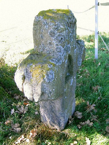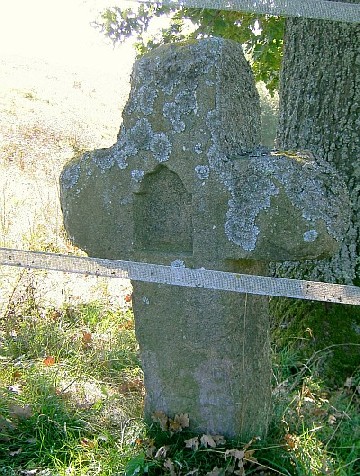 Kreuz weist Risse und Verwitterungsspuren im Kreuzarmbereich auf.