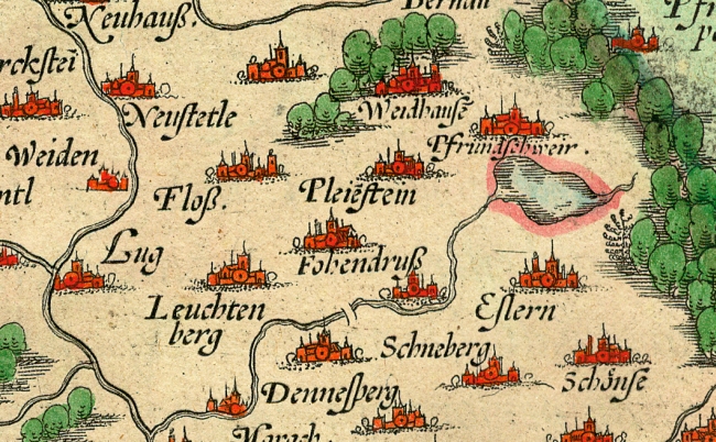 Ausschnitt aus "Palatinatvs Bavariae descriptio Erhardo Reych Tirolense Avctore", Altkol. Kupferstich von Ortelius nach E. Reych. Erste deutsche Ausgabe mit Titelkopfleiste von 1572.