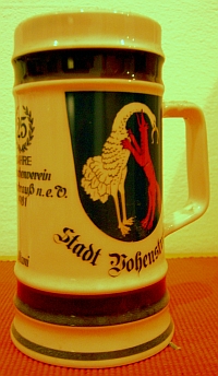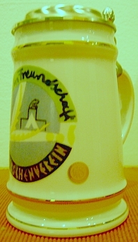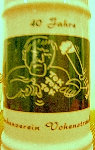 Wie alle Erinnerungskrüge vorher auch, wurde der Krug zum 50-jährigen Jubiläum von unserem Vereins-Künstler Klaus Bäuml entworfen. Man beachte bei allen Entwürfen den immer wieder auftauchenden Vereinspräsidenten, der sich ständig ins Bild drängt.