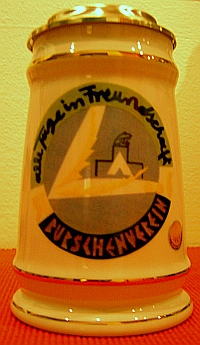Vollmitglieder erkennt man am einheitlich gestalteten Zinnkrug mit Initialen und Widmung auf der Innenseite des Deckels. Nicht jedes Mitglied kennt den momentanen Aufenthaltsort seines Kruges.
