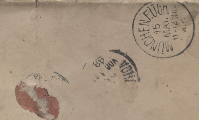gestempelt und mit Wachs verschlossen. Verschiedene Stempel zeigen den Weg, den