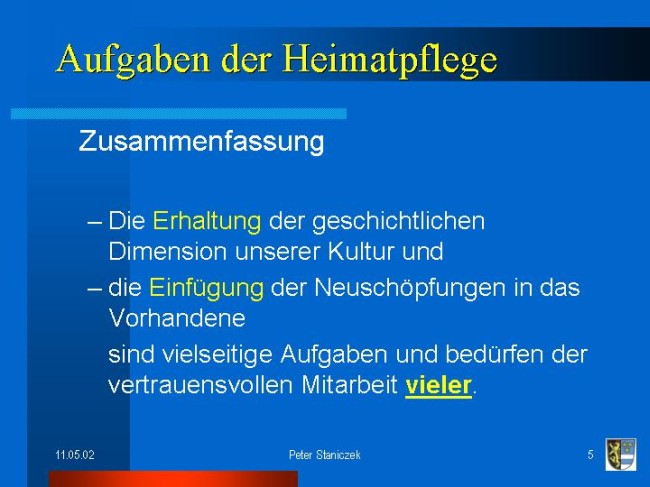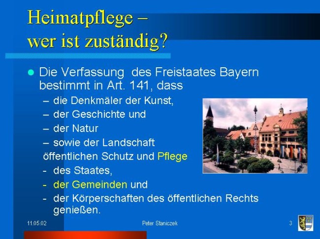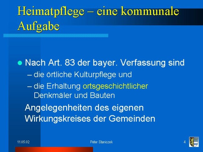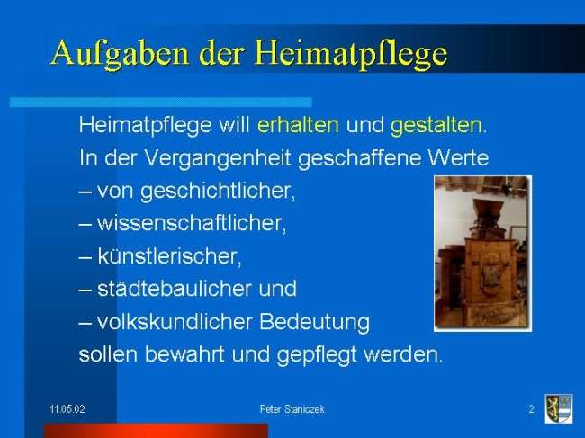 Die Folien wurden erstellt anlässlich eines Vortrages zur Arbeitstagung der bayerischen Heimatpfleger unter dem Motto "Heimat im Wandel" am 12. Mai 2002 in Weiden in der Oberpfalz: