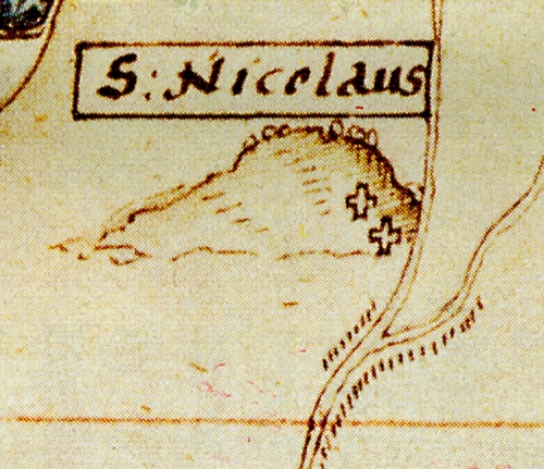 Nikolauskirchen liegen oft an frühmittelalterlichen Altstraßen, auch Steinkreuze sind Begleitmerkmale dieser frühen Verkehrssysteme. Um welche Nikolauskirche handelt es sich auf dieser Karte von 1600? Lösung: Kath. Kirche St. Nikolaus auf dem 529 m hohen Nikolaiberg am nördlichen Ortsrand von Floß, Landkreis Neustadt a. d. Waldnaab, Abbildung: Vogel´sche Karte von 1600, in: Dr. Adolf Wolfgang Schuster, 1000 Jahre Floß, Marktgemeinde Floß 1976, S. 25 (Karte), 100 (Steinkreuz), 209 (Foto) Die richtige Lösung fanden: Magdalena Fillep und Konrad Zeitler
